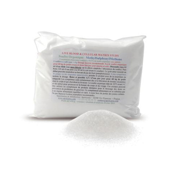 El MSM (metil-sulfonil-metano) es un metabolito del azufre que se encuentra en la naturaleza. Es biodisponible para el organismo y puede asimilarse fácilmente. El Dr. Stanley Jacob ha llevado a cabo una amplia investigación sobre esta sustancia en el Instituto de Salud de Oregón (EE.UU.). Puede consultar sus publicaciones. Calentando DMSO a cierta temperatura, se obtiene por cristalización el compuesto puro, el azufre orgánico. Esta sustancia no tiene olor particular y su sabor es ligeramente amargo. Es completamente natural y el organismo lo absorbe directamente.